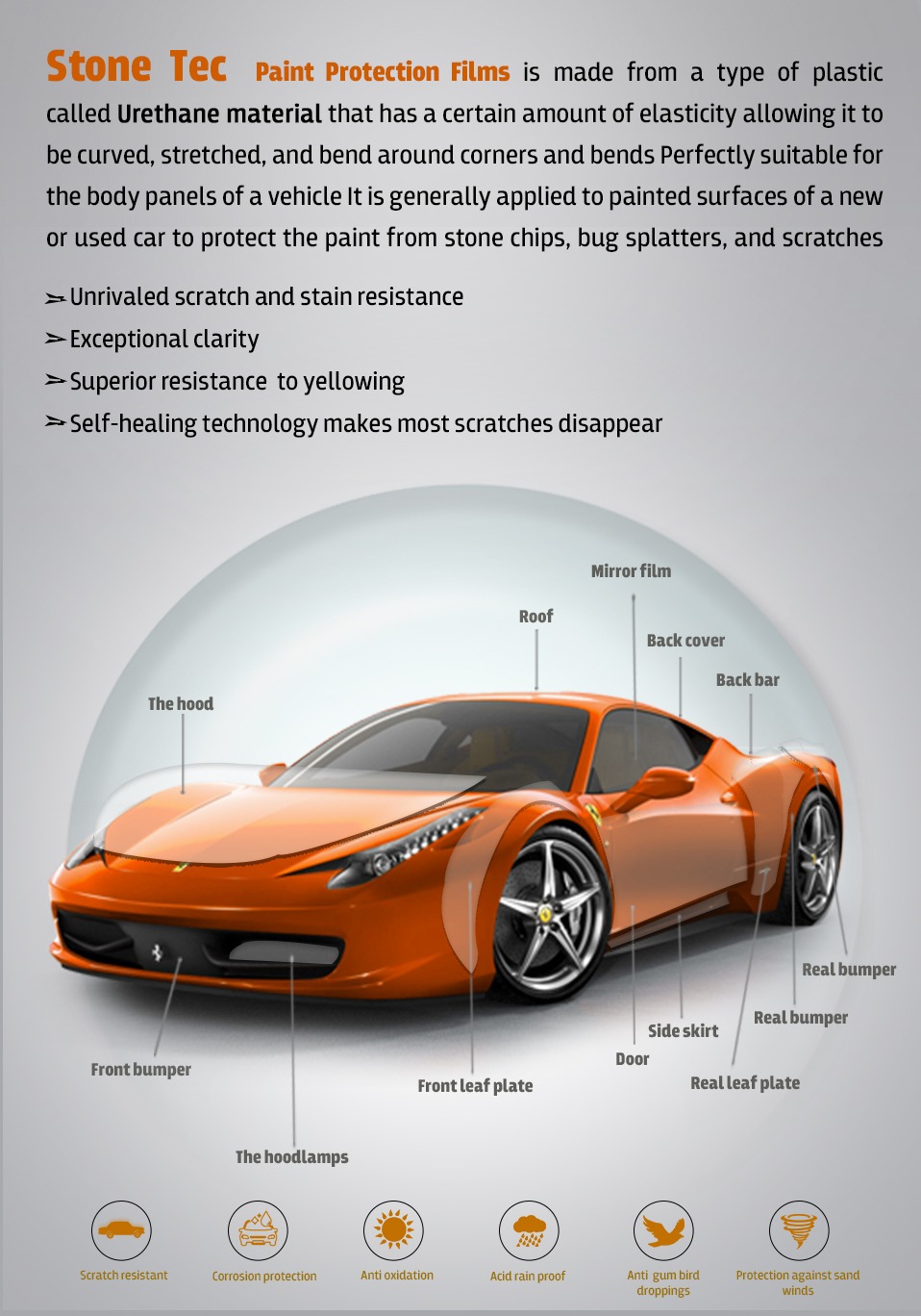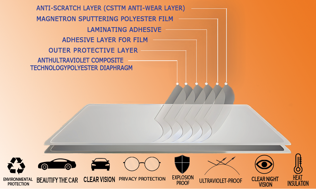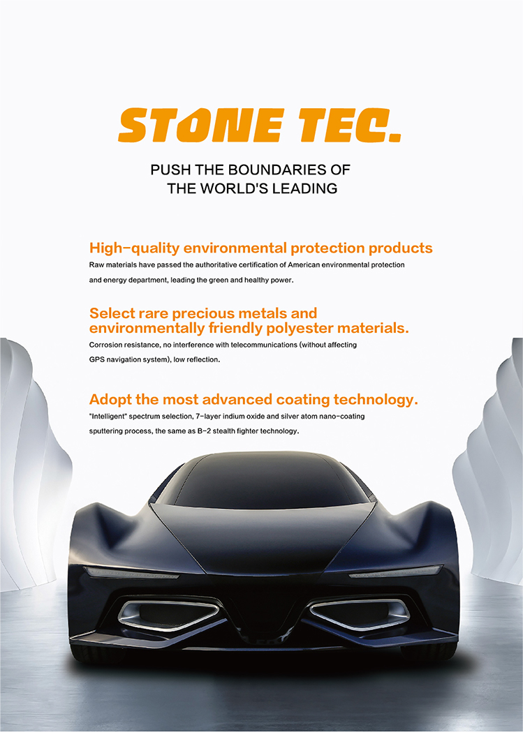 1-high clear PET raw material 2-Best nano ceramic coating. 3-Highest sun heat rejection to save A/C energy. 4-100% UV rejection to protect your health and car inside decoration. 5-Different color and VLT to meet your requirement. 6-Anti-explosion ,make protection when glass breakage. 7-Privacy protection and car window decoration